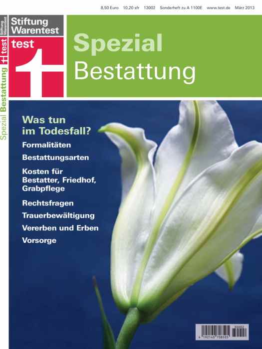 1 spezial bestattungen2013-1-fullWenn ein Mensch verstirbt, müssen Hinterbliebene zahlreiche Aufgaben bewältigen. Schritt für Schritt wird in diesem Heft erklärt, welche Formalitäten zu erledigen sind und wie die Angehörigen den richtigen Bestatter finden. Eine Bestattung kostet in Deutschland durchschnittlich 6000 Euro. Ein Überblick über sämtliche Kosten und eine detaillierte Checkliste helfen beim Preisvergleich. Neben Erd- und Feuerbestattung werden alternative Bestattungsformen beschrieben. Außerdem informiert dieses Heft über Möglichkeiten der frühzeitigen Vorsorge in Form von Vorsorgeverträgen und Sterbegeldversicherungen. Antworten auf rechtliche Fragen zu den Themen Bestattung, Testament, Patientenverfügung und Bestattungsvorsorge geben Ihnen Orientierungshilfen.