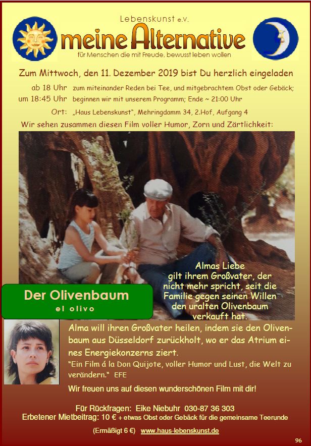 Im Oktober wurde unser großer Saal renoviert und unser  Abend musste leider ausfallen. So nehmen wir den ausgezeichneten Film „Der Olivenbaum“, eine Tragikomödie; zum Anlass, über Liebe und Zorn, nachhaltige Ökologie und gewinnträchtige Ökonomie Gedanken auszutauschen.