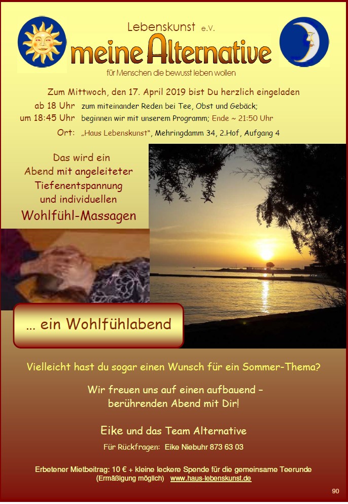 Das Team von "meine Alternative" lädt einmal im Monat mittwochs im Haus Lebenskunst zu einem gestalteten Abend ein, immer mit Gedankenaustausch.