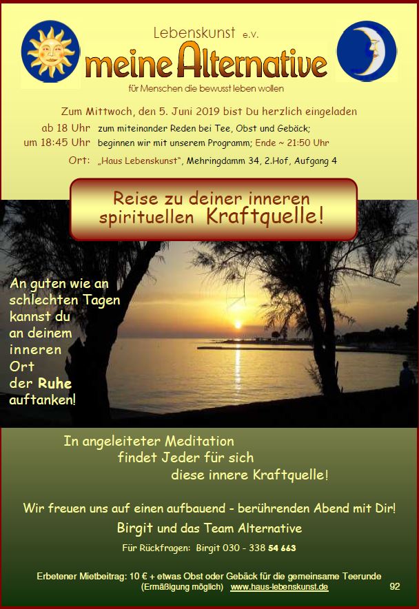 Das Team von "meine Alternative" lädt einmal im Monat mittwochs im Haus Lebenskunst zu einem gestalteten Abend ein, immer mit Gedankenaustausch.