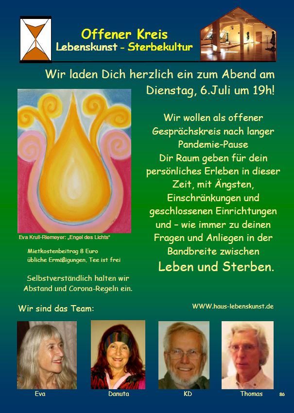 Der Offene Arbeitskreis Lebenskunst - Sterbekultur lädt einmal im Monat dienstags im Haus Lebenskunst ein zu einem Gedankenaustausch.