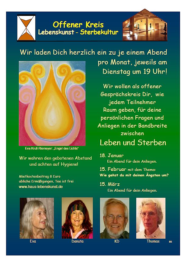 Der Offene Arbeitskreis Lebenskunst - Sterbekultur lädt einmal im Monat dienstags im Haus Lebenskunst ein zu einem Gedankenaustausch.