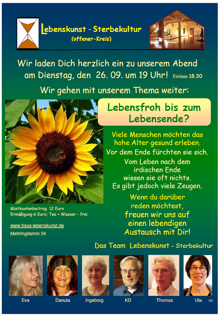 Der Offene Arbeitskreis Lebenskunst - Sterbekultur lädt einmal im Monat dienstags im Haus Lebenskunst ein zu einem Gedankenaustausch.