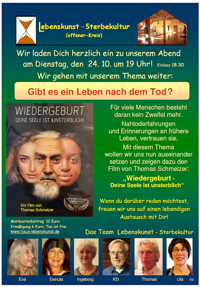 Der Offene Arbeitskreis Lebenskunst - Sterbekultur lädt einmal im Monat dienstags im Haus Lebenskunst ein zu einem Gedankenaustausch.